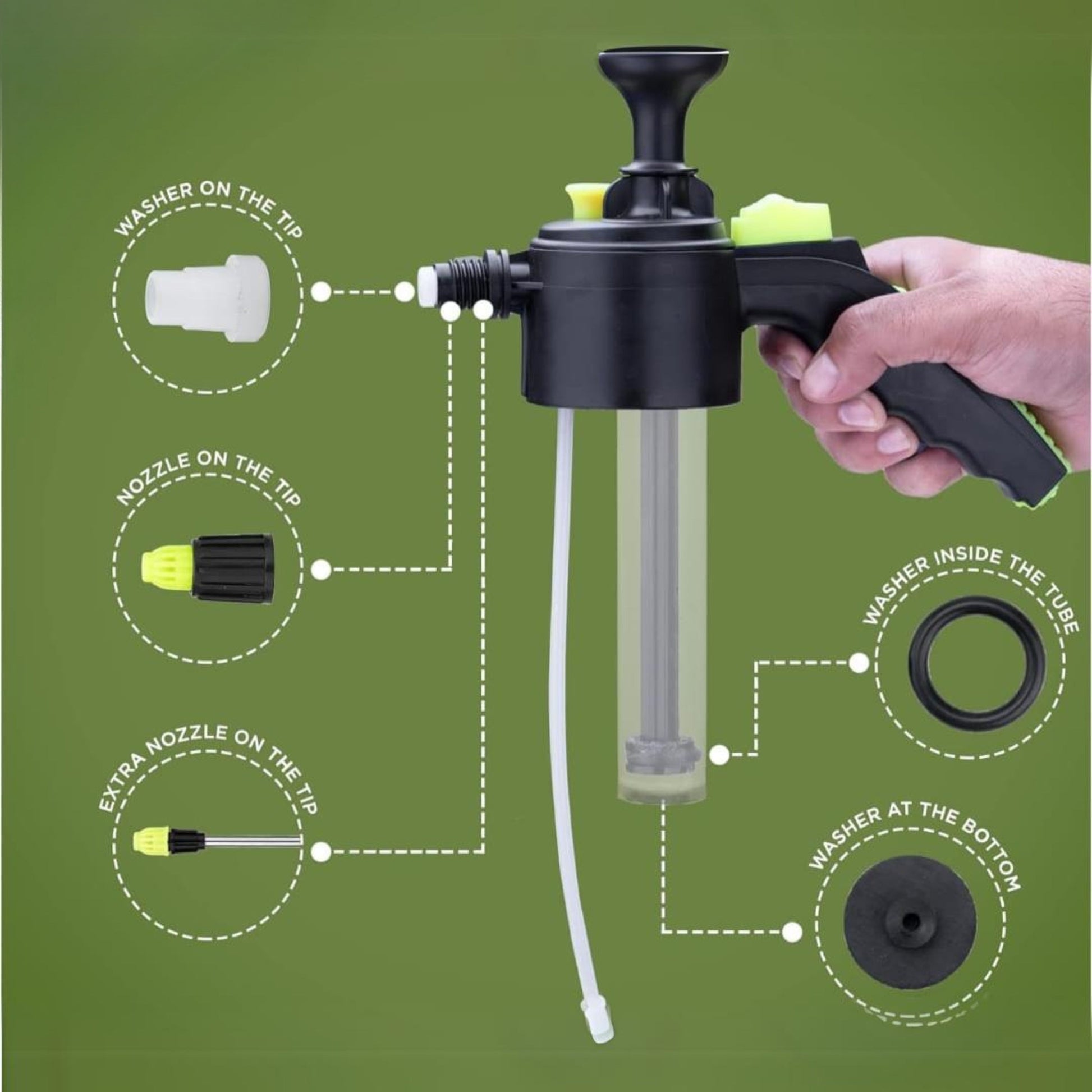 With its fine mist and adjustable flow, the sprayer conserves water and liquid solutions.