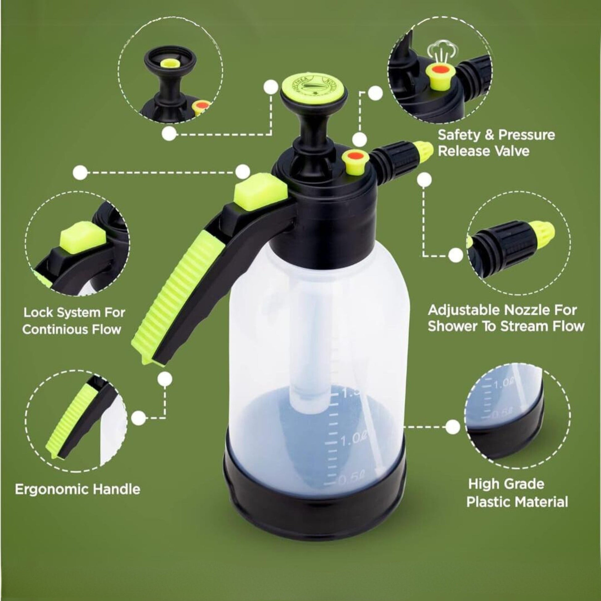 The pressure sprayer features a pressure release button for safe use. The measurement markings makes it easy to fill accurately and avoid overfilling.