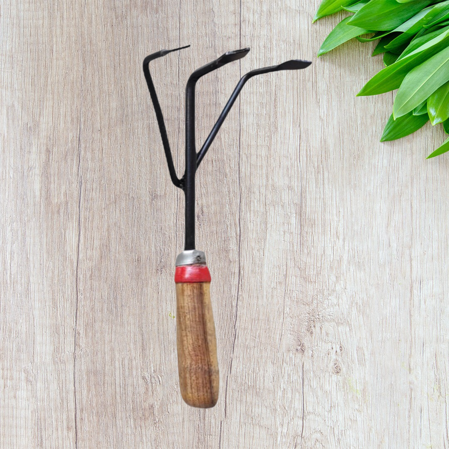 - Hand cultivator is a simple tool with rake-like heads. The rake-like/ claw-like edge has three tines which enables digging up the soil, loosening soil to better air circulation and removing weeds.