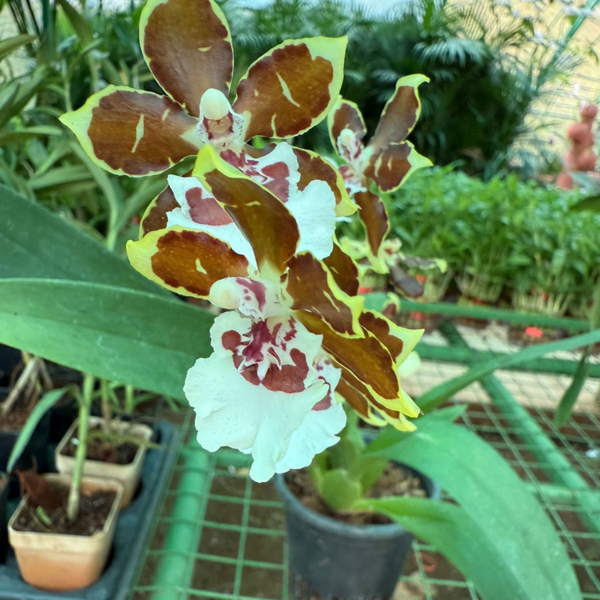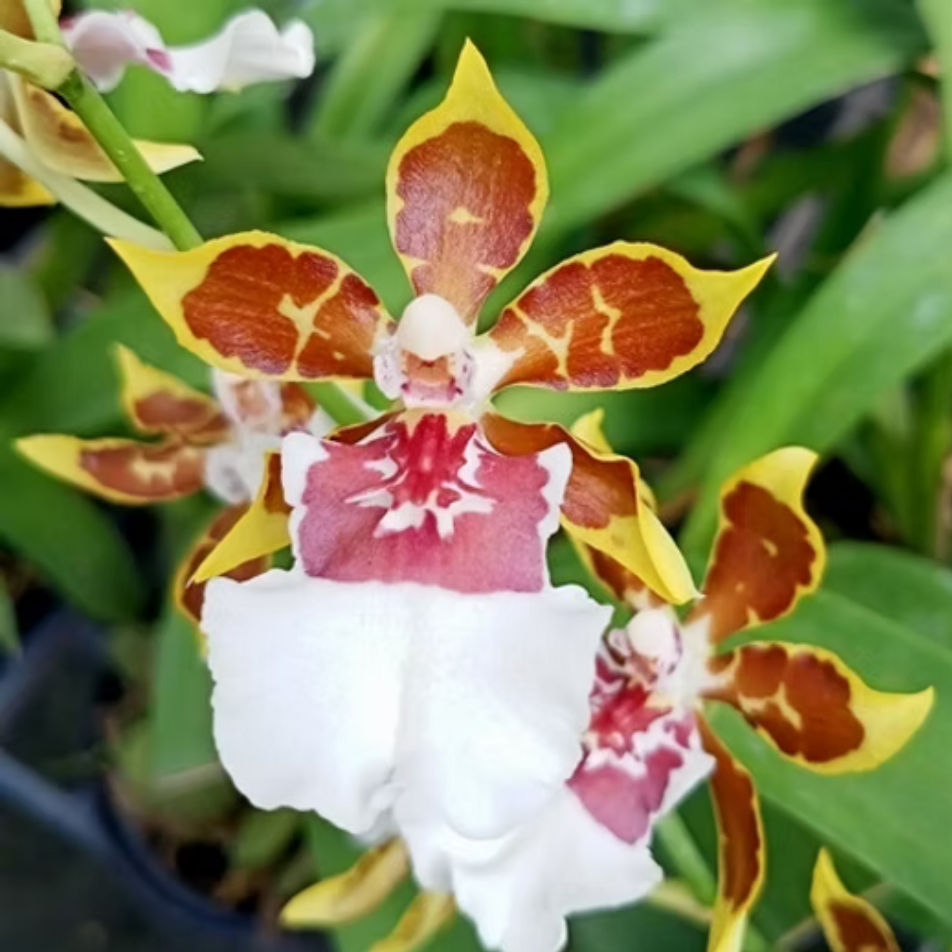 The Oncidium Dancing Lady Orchid is a rare and exotic variety that captivates with its brown, golden-yellow, and white patterned blooms. Its distinctive petals resemble a dancing figure, making it one of the most eye-catching orchids for collectors and plant lovers.